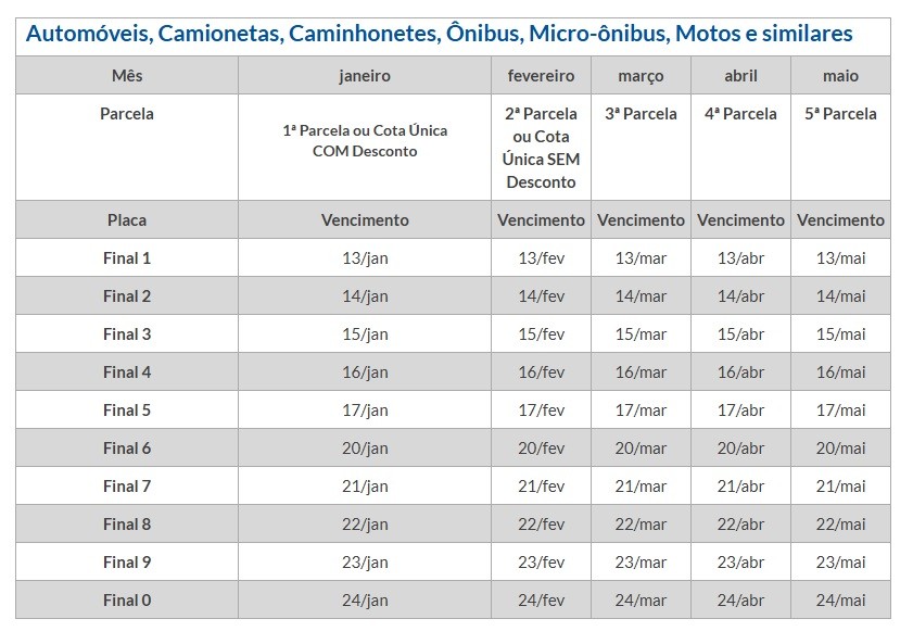 A data de vencimento das parcelas vai depender do final da placa de cada veículo, conforme abaixo: