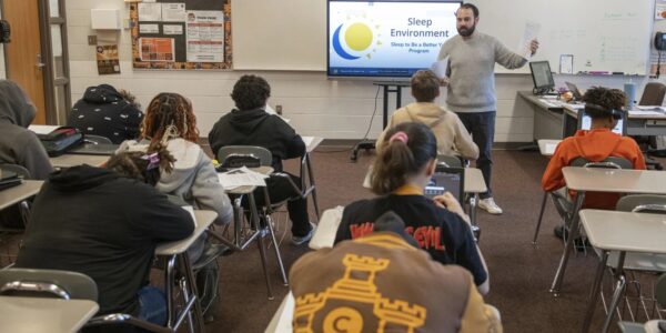 Sono insuficiente pode aumentar problemas de humor, saúde física e mental. ‘Você ficaria surpreso com a quantidade de jovens que simplesmente não sabem como fazer isso’, diz professor. Tony Davis em aula sobre a importância do sono. AP Photo/Phil Long…