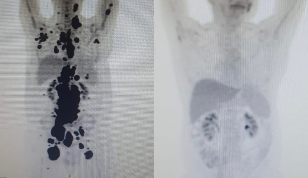 Exames mostram antes e depois de câncer de paciente; à direita, imagem mostra remissão da doença